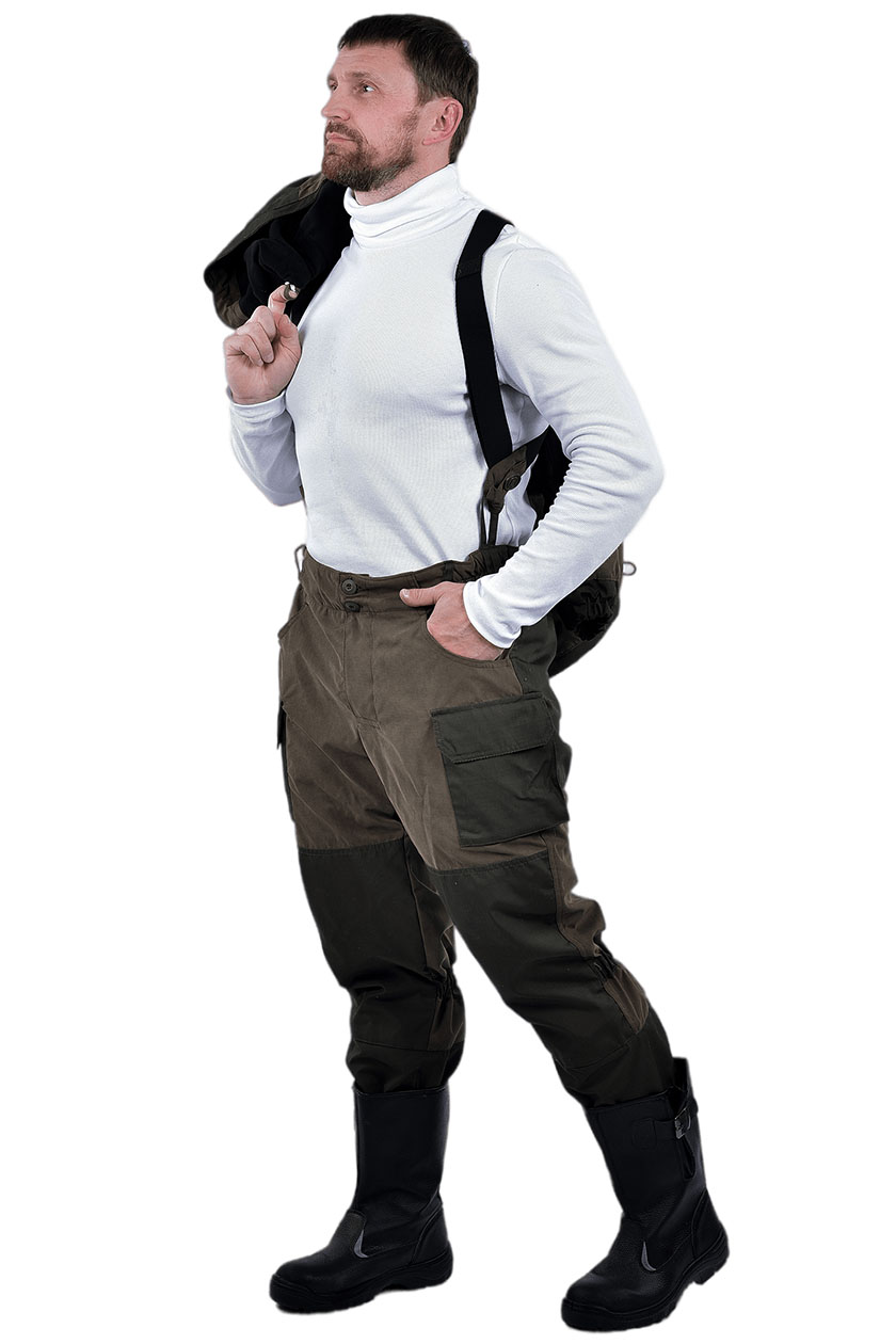➠ Брюки со съемными бретелями, на подкладке из флиса, с застежкой в среднем шве на тесьму – «молнию». Цельнокроеный пояс стянутый эластичной лентой для прилегания к фигуре с застежкой на пуговицу и петлю. Боковые карманы накладные, объемные с отрезным бочком и фигурной линией входа с клапаном на контактной ленте.
