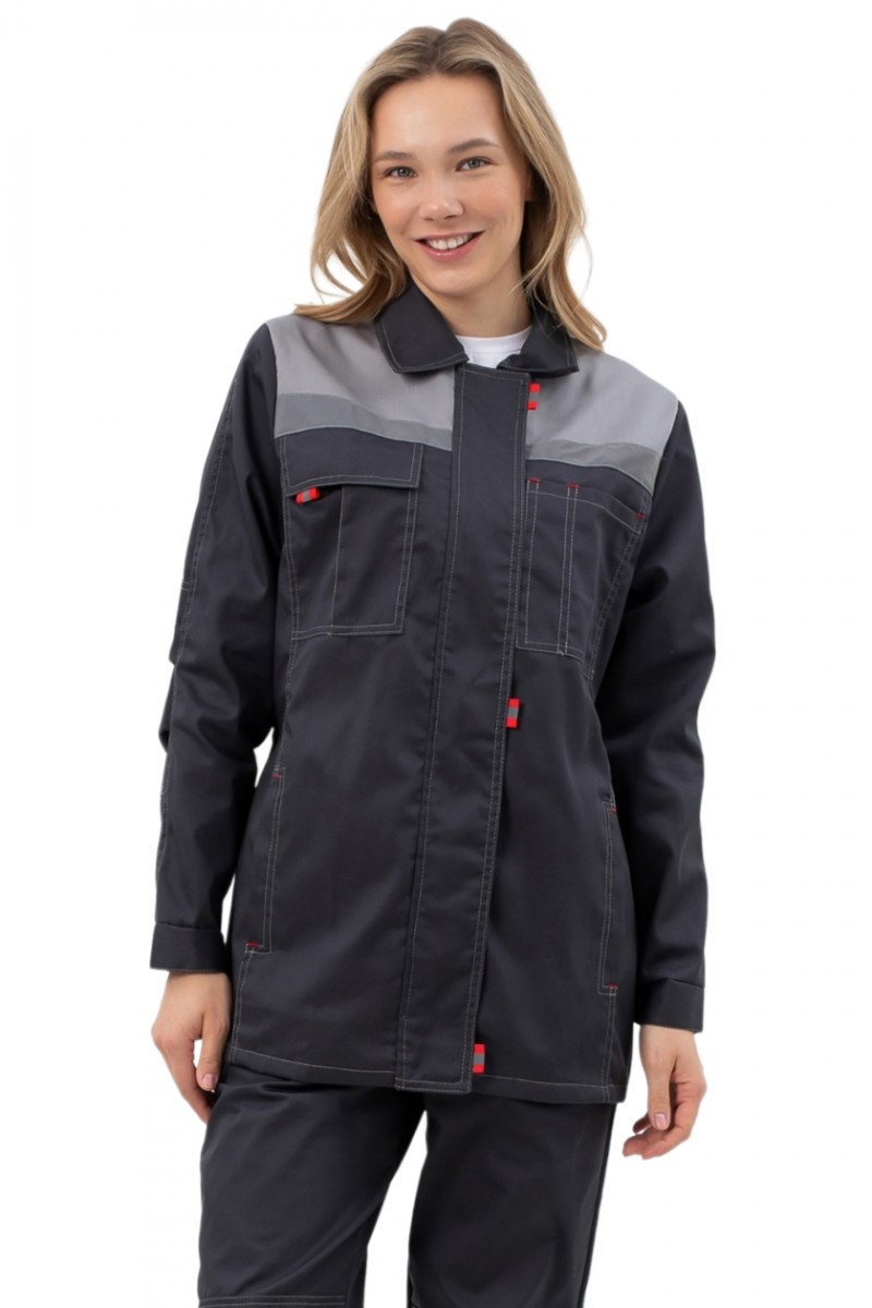 ➠ Куртка прямого силуэта с контрастной кокеткой, с застежкой на молнию с ветрозащитным клапаном, застегивающимся на липучку с отложным воротником. На полочках накладные карманы, левый с отделением под карандаш, правый с клапаном и застежкой на липучку. В шве притачивания бочков обрабатываются боковые карманы куртки с вертикальным входом с цельнокроеной листочкой. Рукава с налокотниками и складками на уровне локтя для эргономичности, с притачными манжетами с застежкой на пуговицу и горизонтальной шлицей. По линии талии кулиса с эластичным шнуром, для регулировки по фигуре.