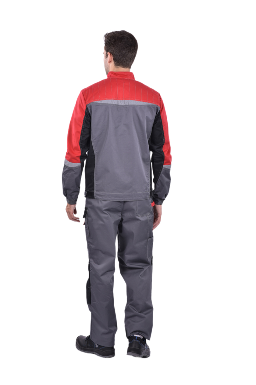 ➠ Куртка: цвет серый с красной и черной отделкой, силуэт прямой, пояс притачной, застежка на молнию, воротник стойка. Накладные карманы комбинированные с малыми накладными карманами с разделителями. Прорезные карманы на нижней части полочки. По шву притачивания кокетки вверху и по рукавам фигурные вставки СОП.